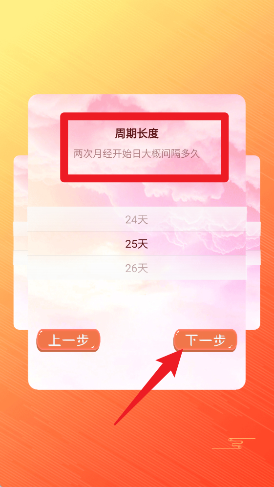3、继续填写【周期长度】,即两次月经开始日的大致间隔天数,然后点击“下一步”。