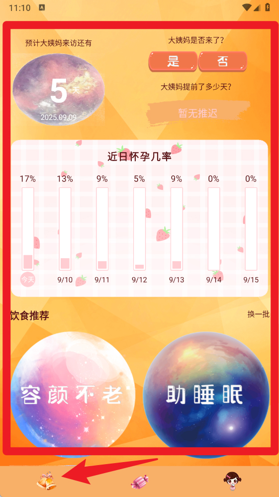 4、进入【首页】,可查看预测的月经到访时间、近期怀孕几率以及饮食推荐,帮助你科学管理健康。