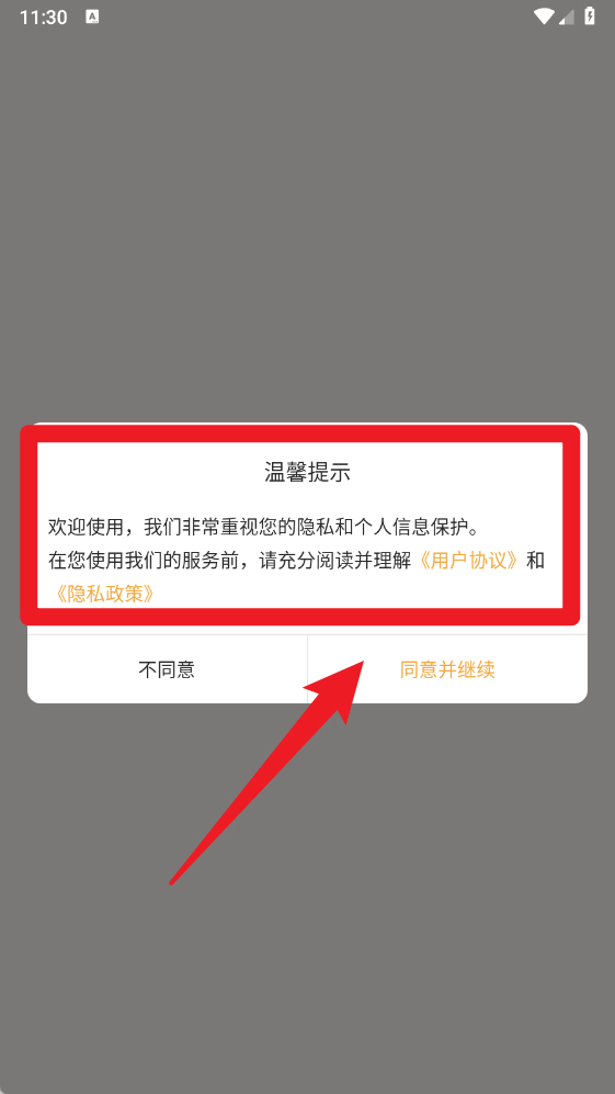 1、首次打开【烟友记】,请仔细阅读《用户协议》和《隐私政策》,点击“同意并继续”即可进入应用。