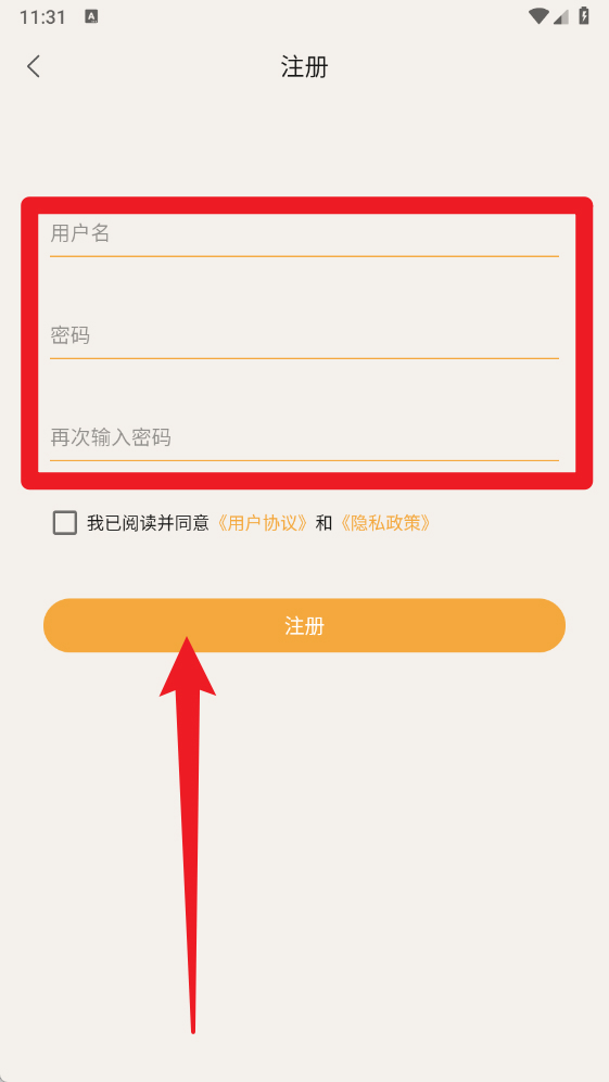 3、新用户在【注册】界面填写用户名、设置密码并确认,即可完成账号创建。