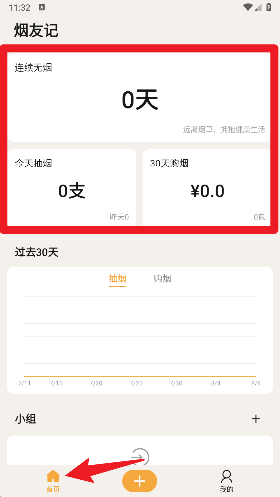 4、进入【首页】,可查看连续无烟天数、当日抽烟支数、30天购烟金额等统计数据,帮助追踪控烟进度。