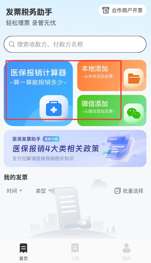 2、首页提供医保报销计算器,支持本地与微信导入发票数据快速处理。