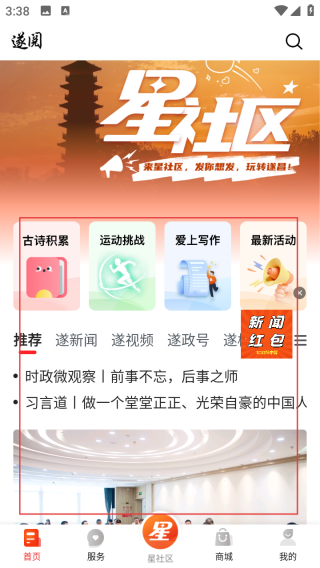1、进入【遂阅】APP首页,参与【古诗积累】【运动挑战】等社区活动,浏览推荐资讯。
