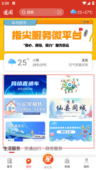 3、切换到【服务】页,使用【网络直通车】【房屋租售】等指尖服务微平台功能。