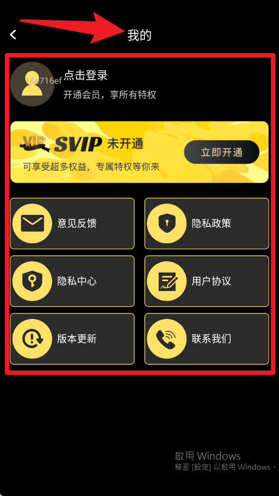 5、在【我的】页面,可以进行登录操作,开通SVIP享受更多特权,并可查看隐私中心、用户协议、版本更新等功能。