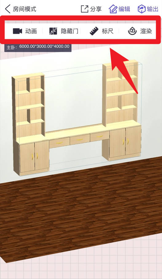 4、在房间模式中,可通过动画、隐藏门、标尺、渲染等工具对柜体进行精准设计,支持现场建模与调整。