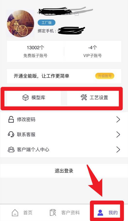 5、点击我的页面,可以查看模型库和工艺设置,同时支持修改密码、联系客服等操作。