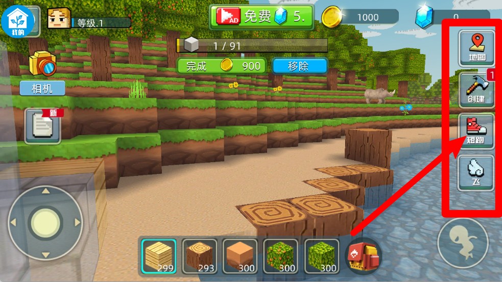 2.功能面板:屏幕右侧提供地图、创建、短跑和飞行等功能按钮,玩家可快速切换使用,提升操作效率与便利性。