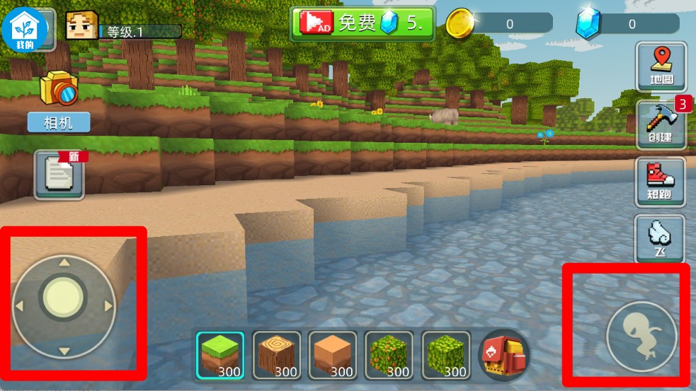 3.操作按键:屏幕左下角为虚拟移动摇杆,右下角为跳跃按键,搭配使用让玩家在像素世界中自由探索与建造冒险。