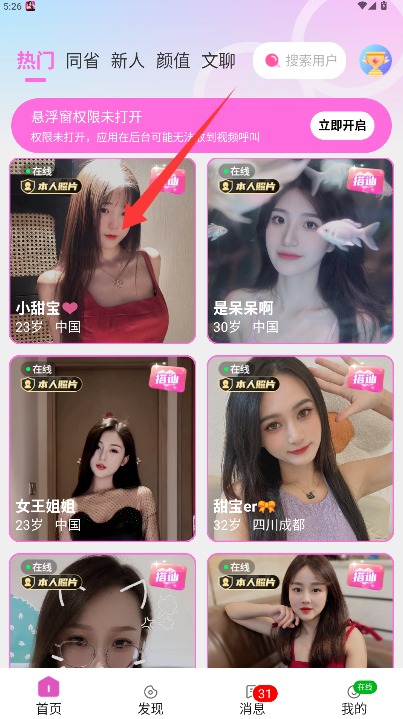3、进入首页界面可浏览系统推荐的用户列表,选择心仪的用户点击封面进入查看。