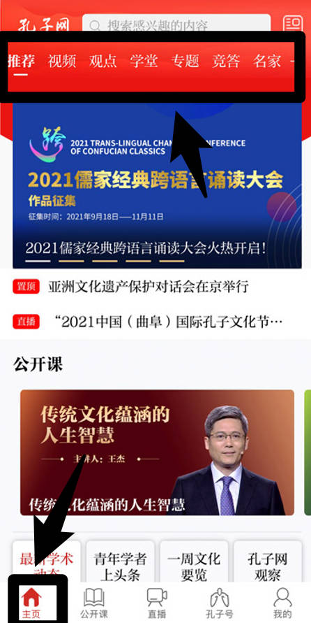 1、主页提供推荐、视频、观点、专题、竞答、名家等栏目,用户可快速浏览最新文化资讯。