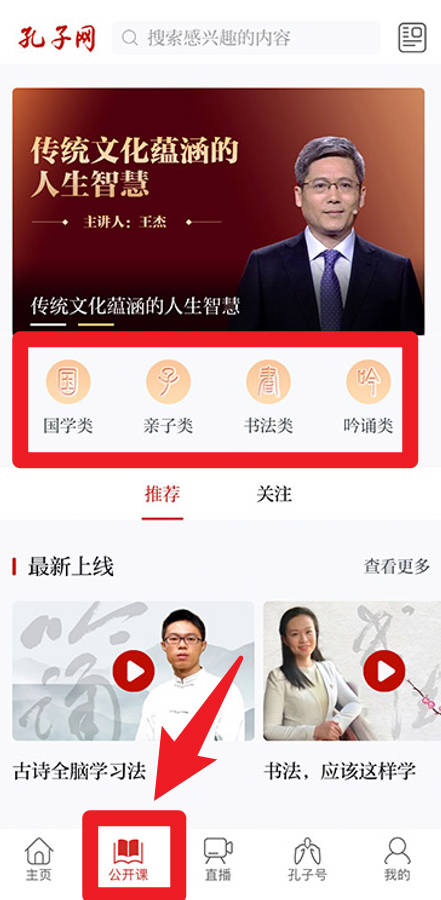 2、公开课页面分为国学类、亲子类、书法类、吟诵类,支持分类学习,还能观看推荐课程。