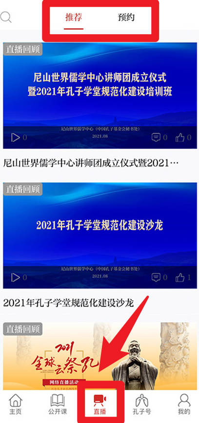 3、直播页面包含推荐和预约两大版块,用户可选择关注并观看实时直播或提前预约课程。