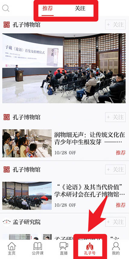 4、孔子号页面支持推荐与关注两种模式,涵盖孔子博物馆、孟子研究院等学术资源。