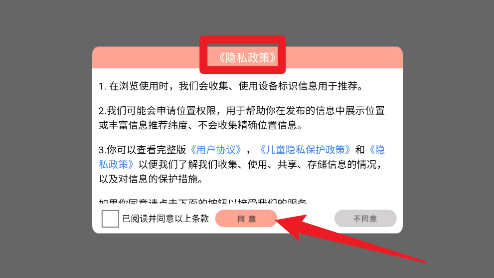 1、首次进入泡泡早教大冒险APP时,会显示【隐私政策】提示,请认真阅读并点击【同意】,以便正常使用功能。
