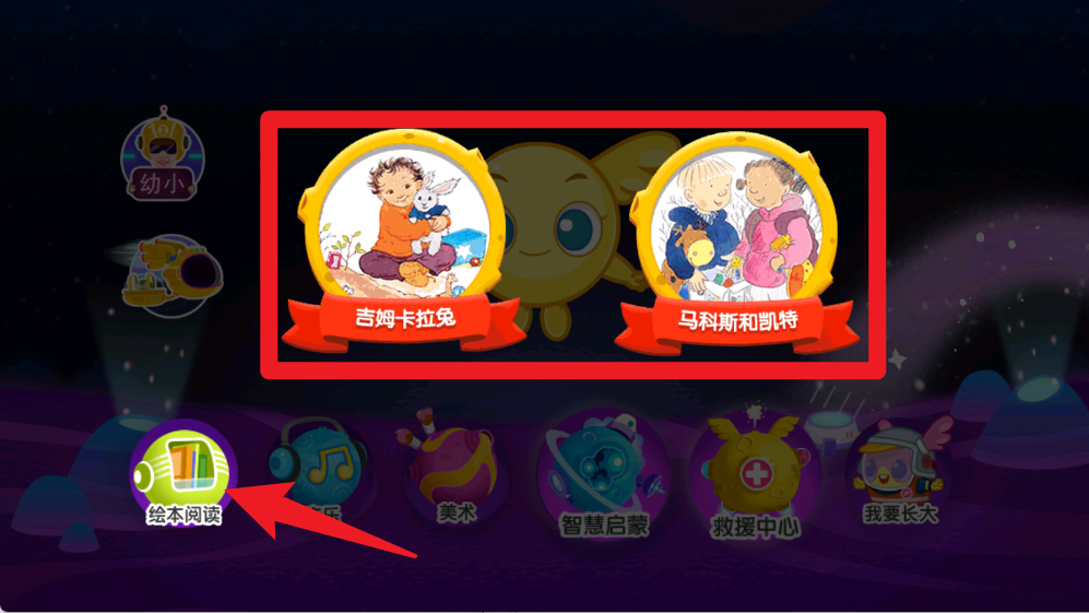 3、进入【绘本阅读】栏目,可以挑选吉姆卡拉兔、马克斯和凯特等经典绘本故事,培养阅读兴趣。