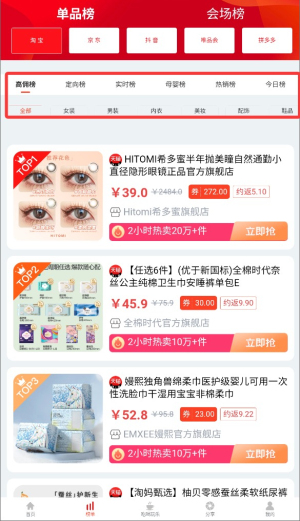 2、在主页面选择"榜单"功能入口,浏览各类热门推荐商品的排行列表。