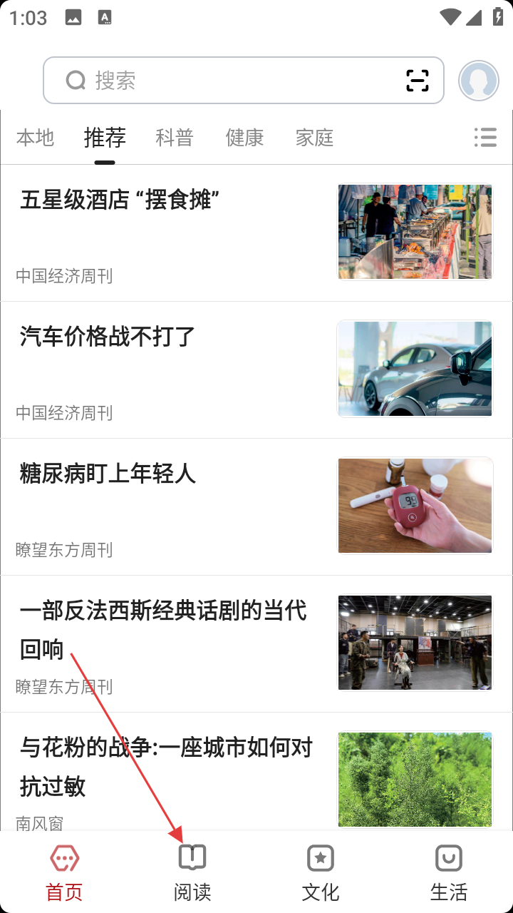 1、打开数字鄂州APP,在首页点击底部【阅读】选项,进入“阅读”页面。