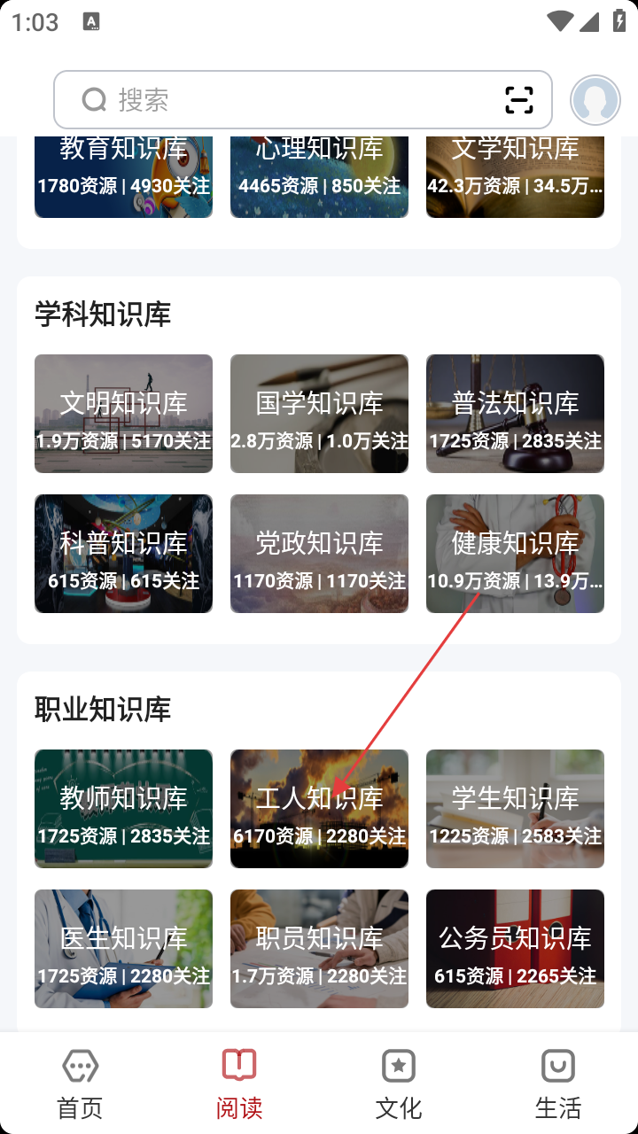 2、在“阅读”页面,找到【工人知识库】并点击进入,查看相关分类内容。