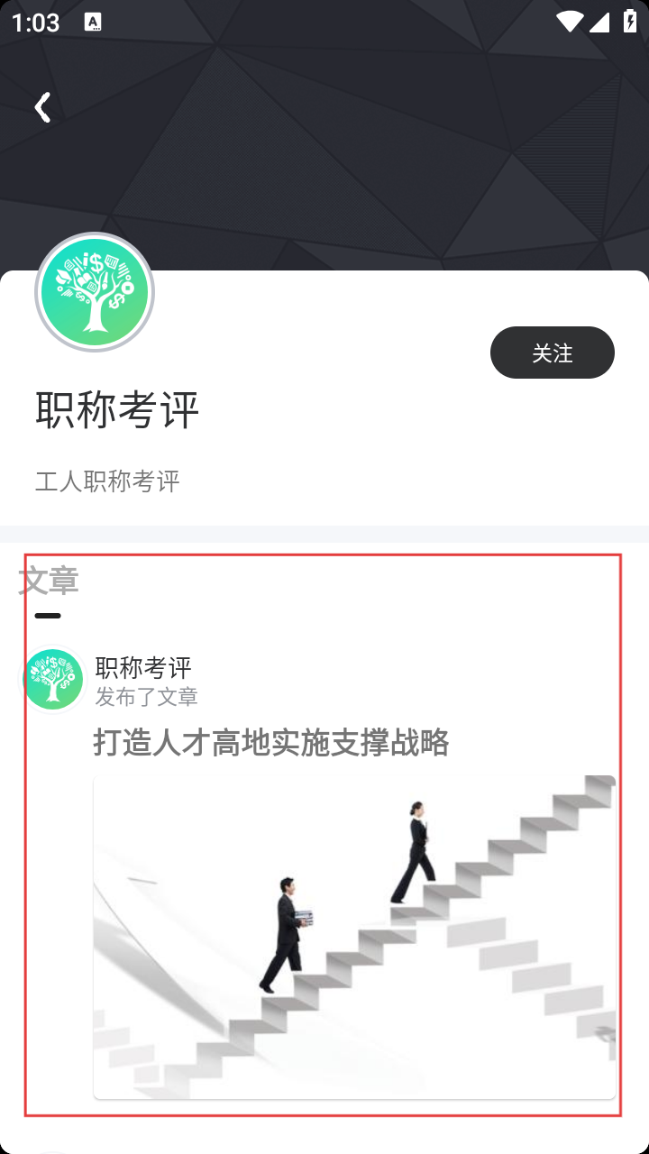 4、在“职称考评”页面,浏览相关文章,点击文章标题可查看详细内容,也可点击【关注】按钮,以便后续获取该类别的更新信息。