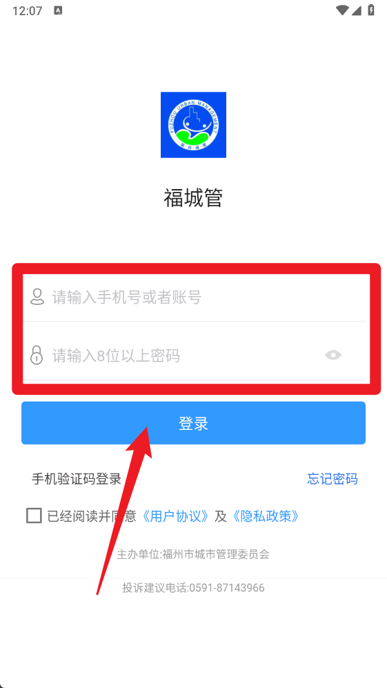 1、首次使用福城管需输入手机号或账号和密码进行登录,也可选择短信验证码登录。