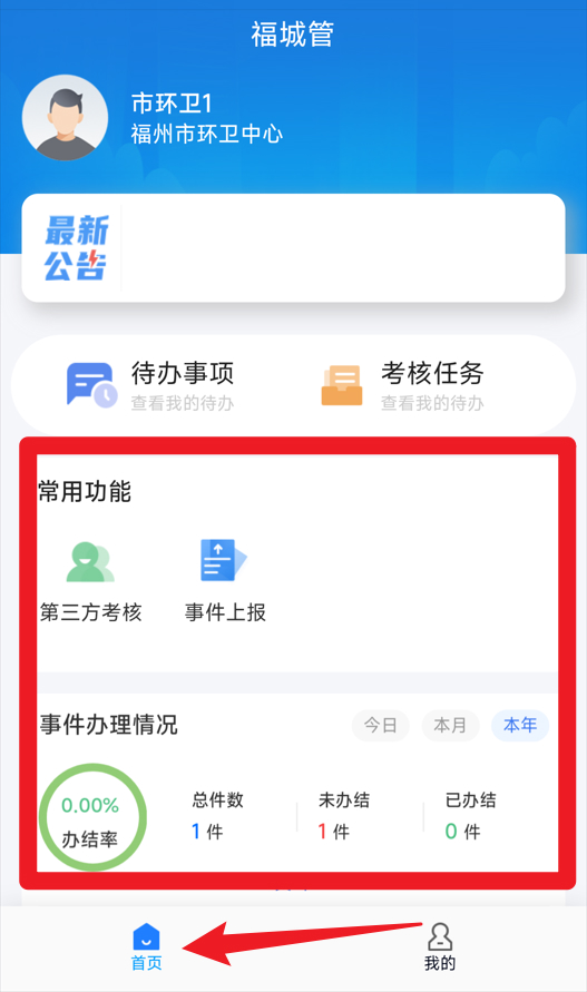 2、在【首页】可查看待办事项、考核任务,并能使用常用功能如第三方考核、事件上报,同时可实时掌握事件办结情况。