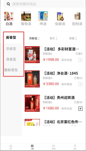 2、在首页导航栏选择"酒品分类"选项,浏览各类精品酒水和限量款商品信息。
