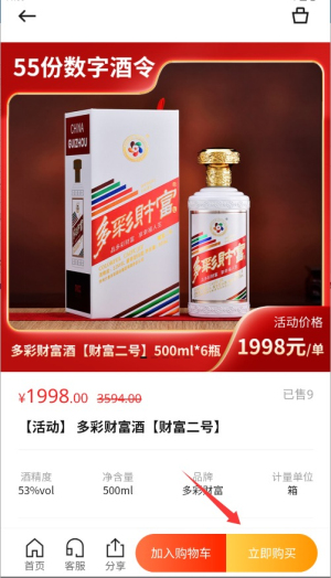 4、在商品详情页面点击"立即购买"按钮,即可完成酒类商品的订购流程。