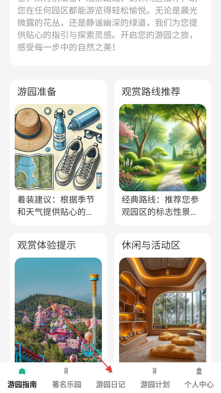 1、打开点点游园宝APP,在底部导航栏点击【游园日记】选项,进入“游园日记”页面。