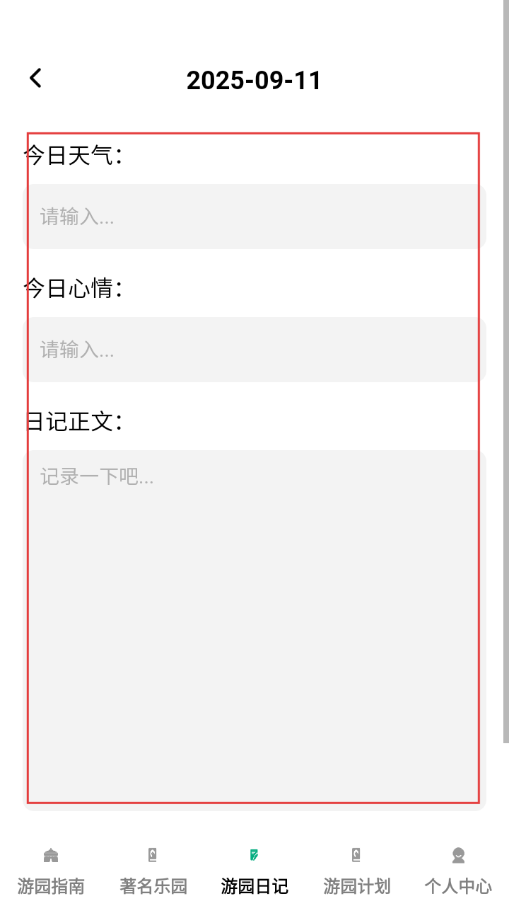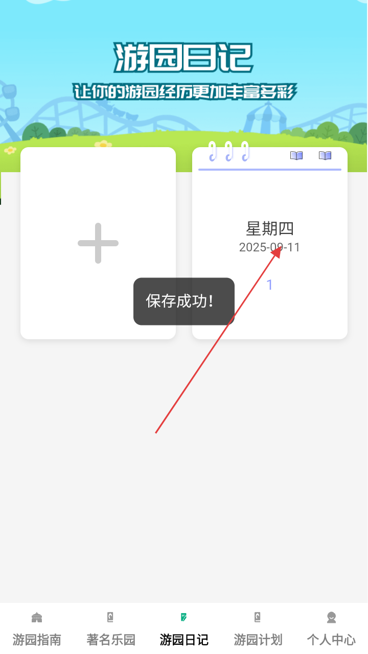2、在“游园日记”页面,点击带有【+】号的空白卡片,进入日记编辑页面。