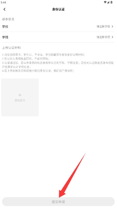 3、完善学院详细资料并上传学生证等证明材料文件,提交后等待系统审核通过流程。