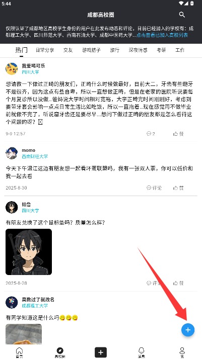 4、进入校园社区主页面浏览热门话题内容,点击发布按钮即可分享自己的动态内容。
