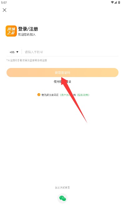 1、在登录界面输入手机号,勾选同意相关协议后点击获取验证码并输入完成登录。