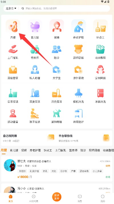 2、进入首页界面,可根据实际需求选择月嫂、育儿师或保姆等各类服务项目。
