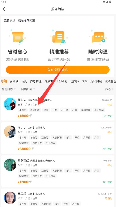 1、查找筛选服务人员操作:通过分类浏览或关键词搜索,仔细查看阿姨详细信息并进行多维度比较选择。