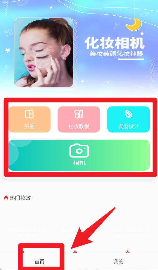 3、首页提供拼图、化妆教程、发型设计和相机功能,可以快速进入对应模块进行体验。