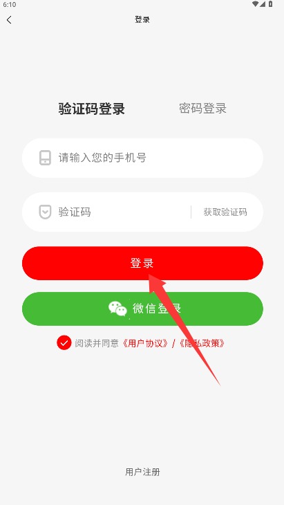 2、在登录页面输入手机号和短信验证码,勾选同意相关条款后点击登录按钮进入。