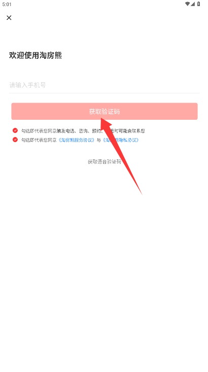 2、在登录界面输入手机号,勾选同意相关协议后点击获取验证码并输入完成登录。
