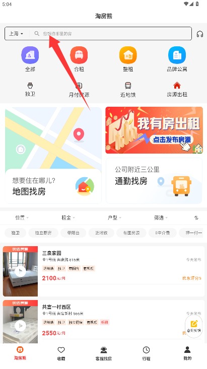3、进入首页通过搜索功能输入房源位置或关键词,查找符合条件的租房信息。