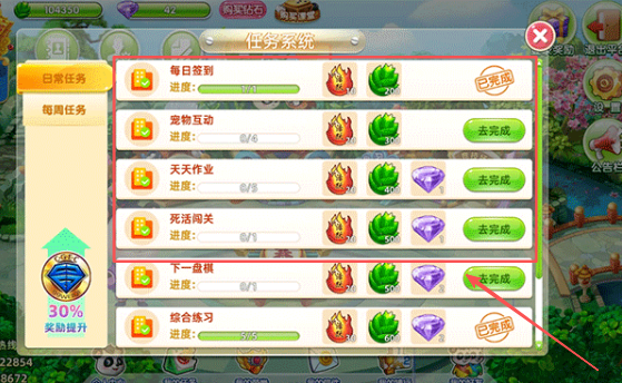 3、领取签到奖励后,在任务列表里找到天天作业任务,点击进入开始完成每天 5 道死活题,积累围棋知识与任务进度。