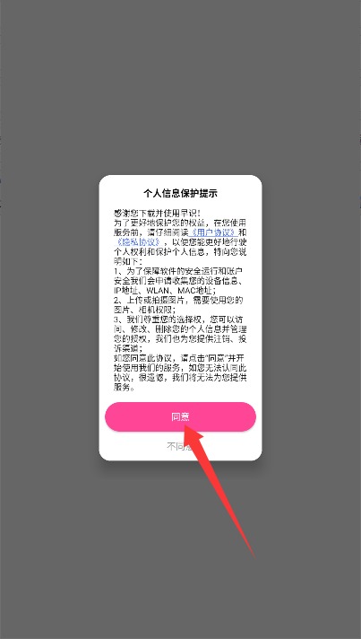 1、初次使用需阅读用户协议与隐私协议,确认后点击同意按钮进入登录界面。