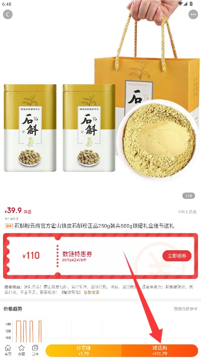 4、进入商品详细界面后,领取优惠券后点击"精选够"按钮下单即可完成购买流程。