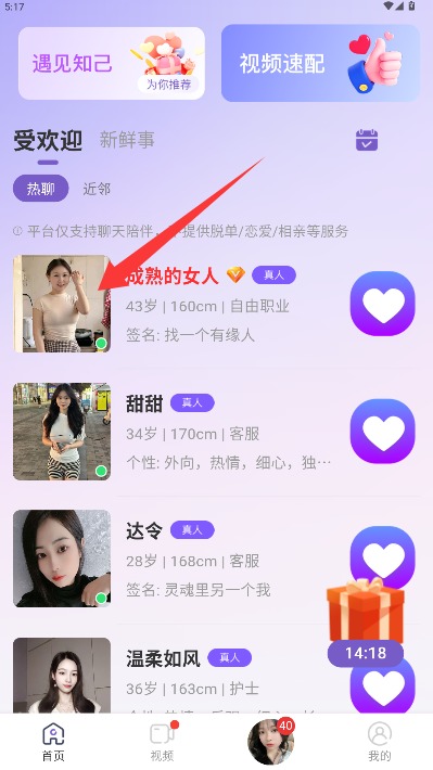 3、进入首页界面可浏览系统推荐的用户列表,选择心仪的用户点击头像进入查看。