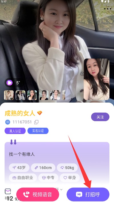 4、进入用户资料页面查看详细信息,点击打招呼功能即可与该用户进行交友聊天。