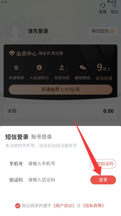 2、在登录页面输入手机号和短信验证码,勾选同意相关条款后点击登录按钮进入。