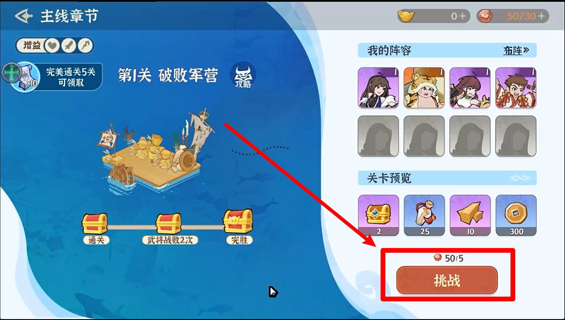 1.挑战按钮:点击挑战需要消耗体力值,体力足够即可进入关卡,战胜敌军后可解锁奖励并推动主线进度。