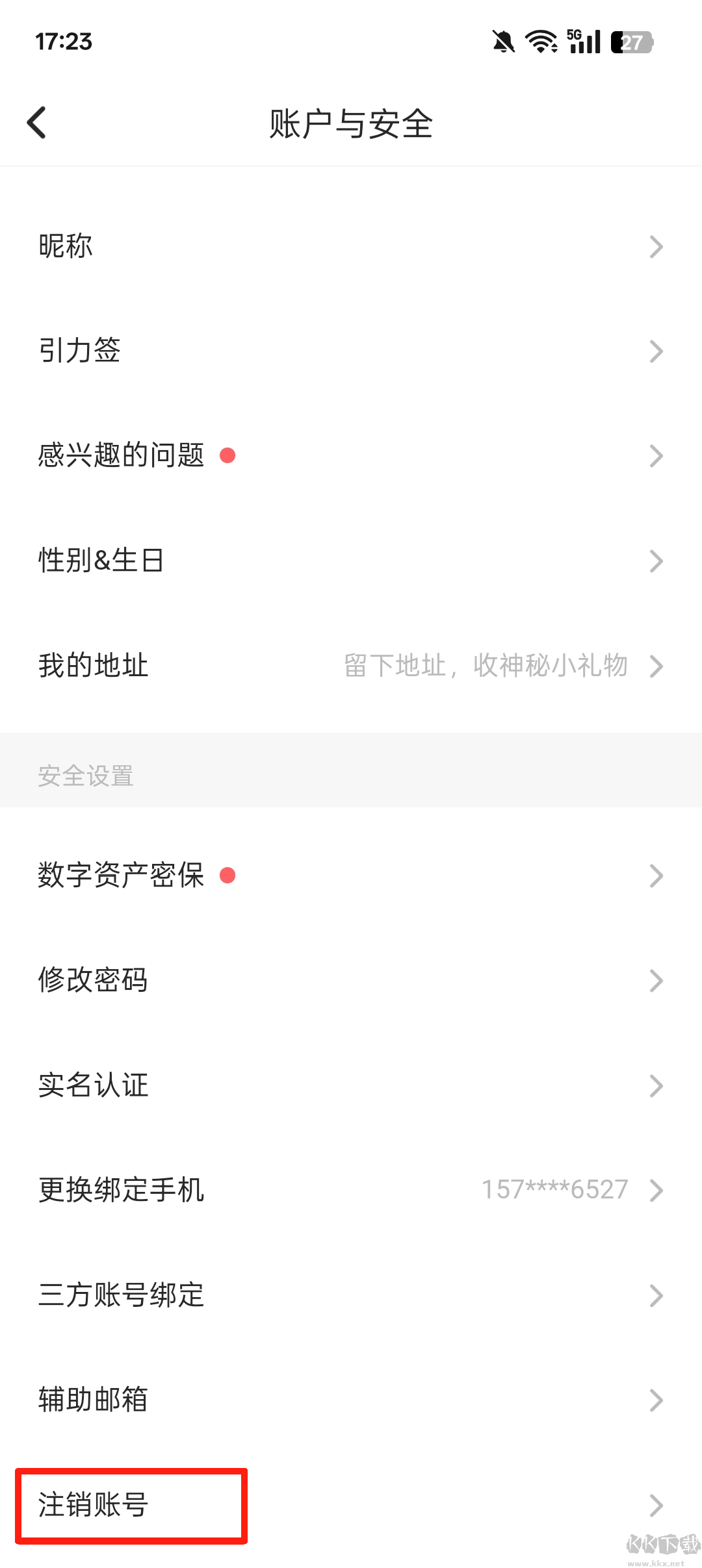 4、下拉找到【注销账号】并点击