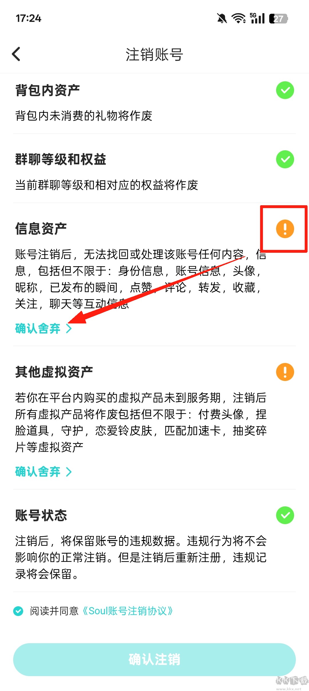 7、全部舍弃之后,点击【确认注销】,之后输入手机验证码即可成功注销
