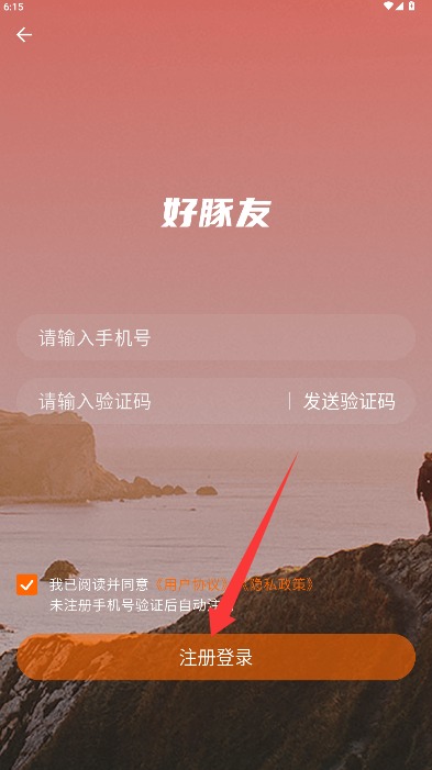 2、在登录页面输入手机号和短信验证码,勾选同意相关条款后点击注册登录进入。