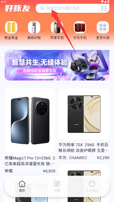 3、在首页界面搜索栏输入商品名称或相关关键词,搜索需要的商品进行浏览。